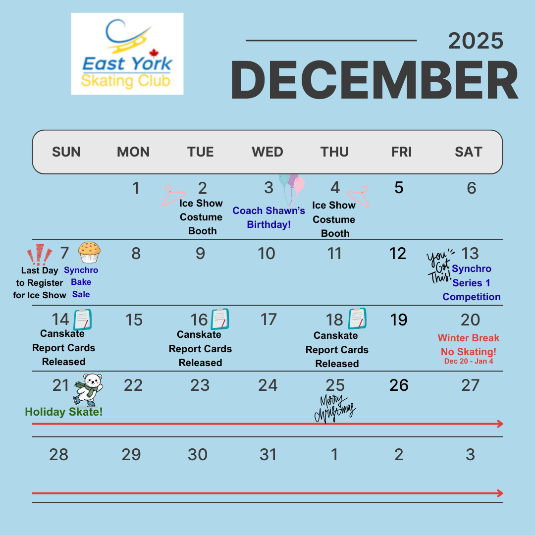 Next week, we will be celebrating the holiday season on the ice. Pre-Bronze and Rising Stars skaters will also be completing their assessments during this time.
